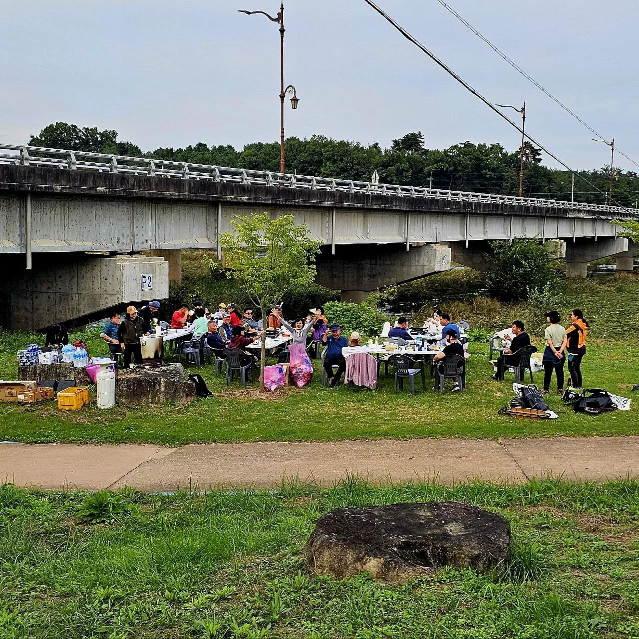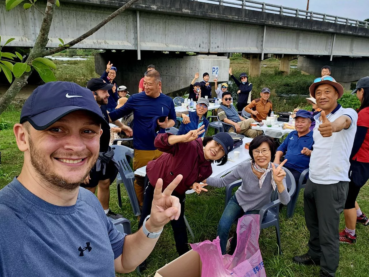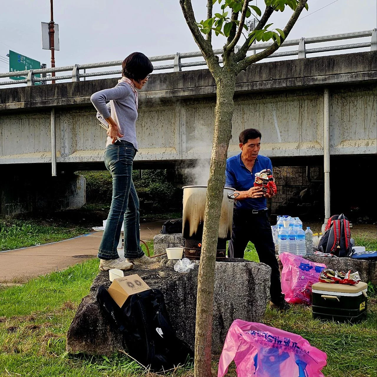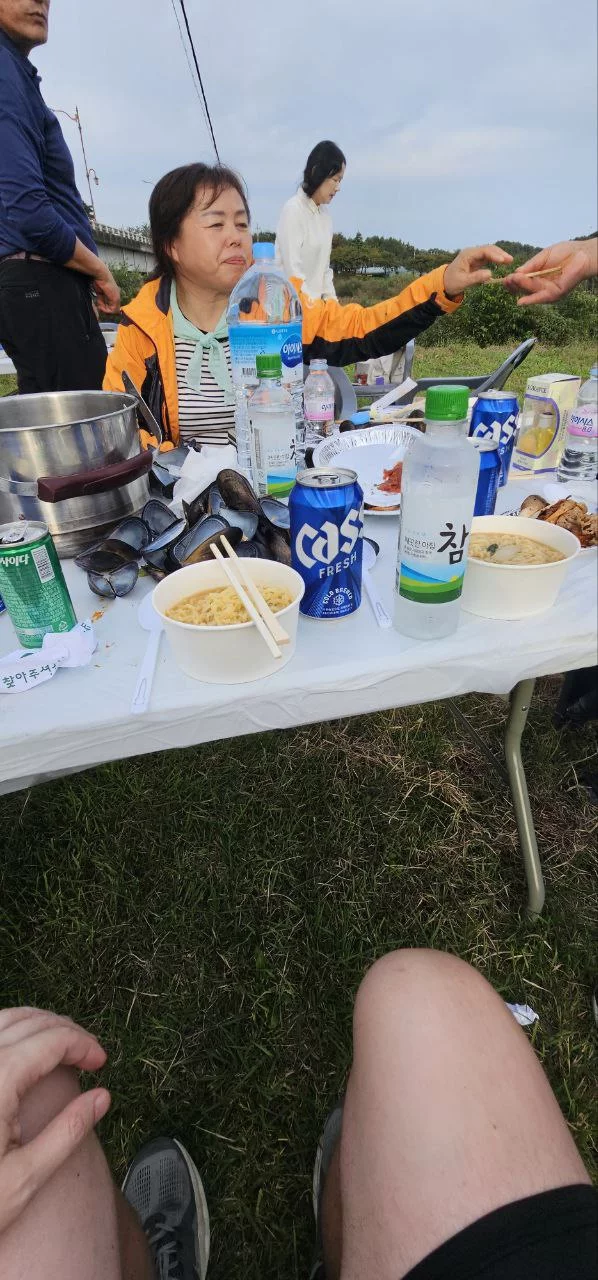 We came across a group of Koreans having a ramen, beer, and soju party by the river. They waved us over with big smiles and loud shouts. One of the ladies was standing over a huge pot on a gas stove, cooking ramen while shouting things in Korean and laughing.
