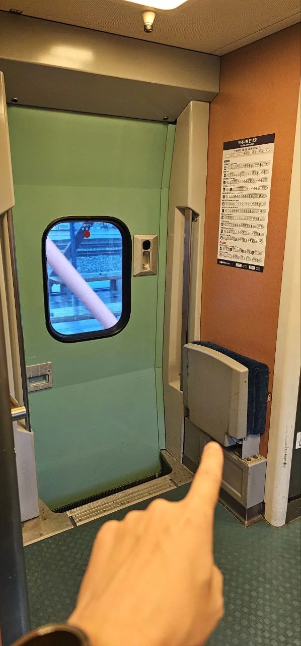 After breakfast we went downstairs to buy our KTX tickets to Busan on the first available train. We managed to get discounted tickets, but sadly they were standing tickets, which meant we did not have reserved seats for the first part of the trip. I ended up using one of the jump seats, which you can see in the photo.