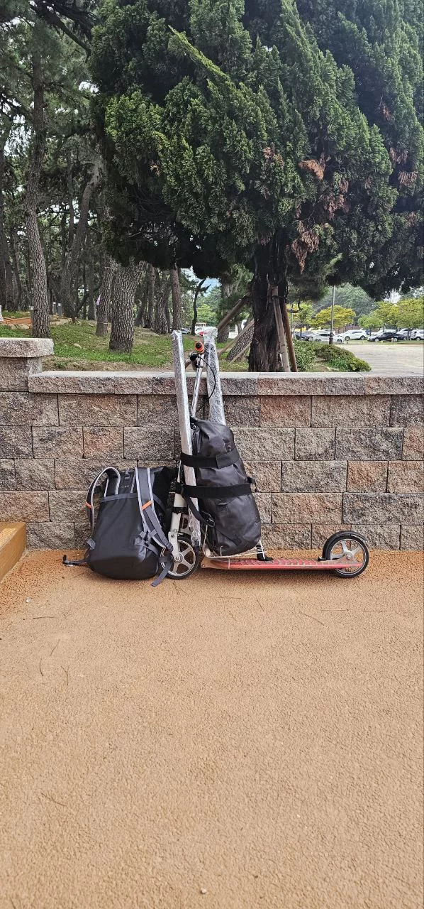 Once we reached Busan, we unpacked the scooters and went for a quick scoot to a local park to complete a secret mission that Alex had. On the way, we ended up on the wrong side of the road, caught between an expressway ramp and a busy four-lane road with trucks and cars. A random Korean man noticed and came over to help. Not only did he give us directions to the park, but he also guided us safely across the road, holding up his hands to stop the traffic. He was a genuinely kind person.