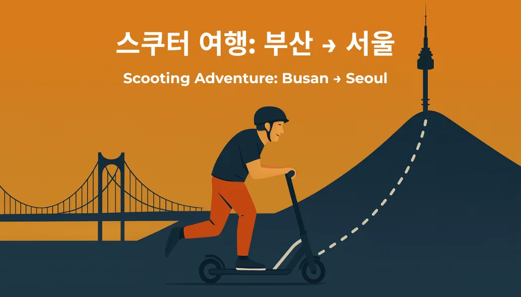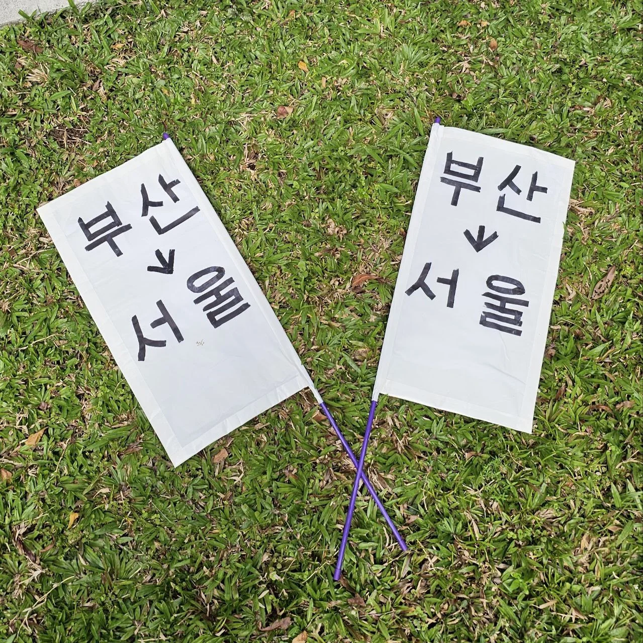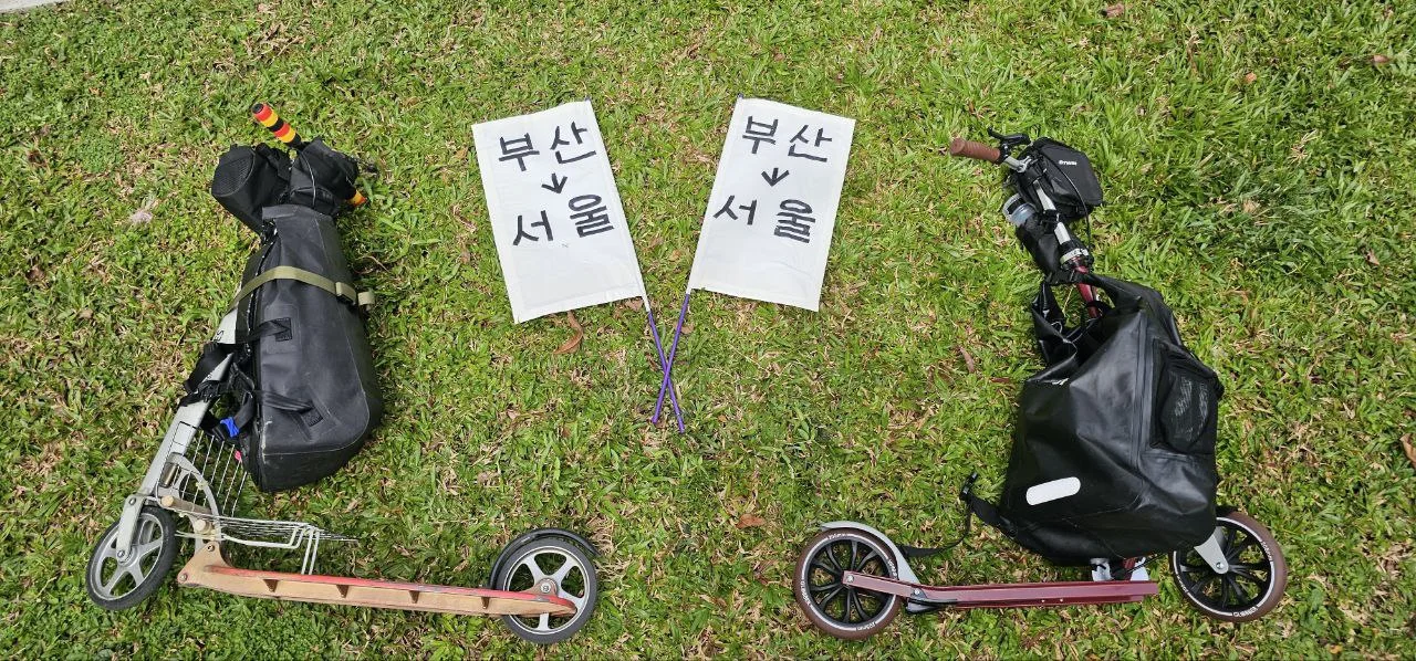 The scooters are packed, the equipment is ready, and we have made our own flags by hand. They read "Busan → Seoul" (부산 → 서울) in Korean. The countdown has started.